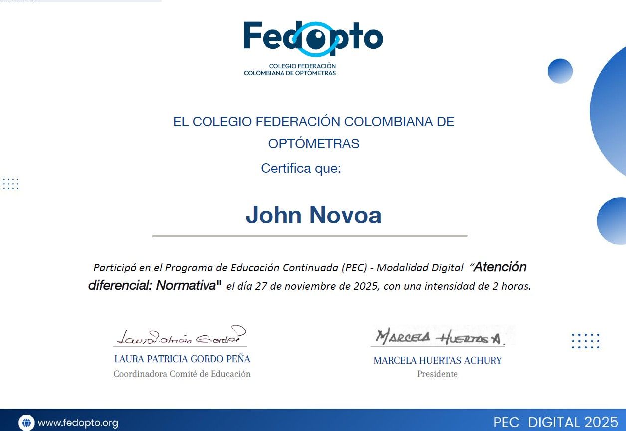 Soy optómetra clínico-funcional con presencia en Cali y Bogotá. Acompaño a cada paciente desde una mirada integral, combinando experiencia técnica con sensibilidad humana. En consulta explico cada hallazgo de forma clara, conectando la salud visual con el estilo de vida y el bienestar general.